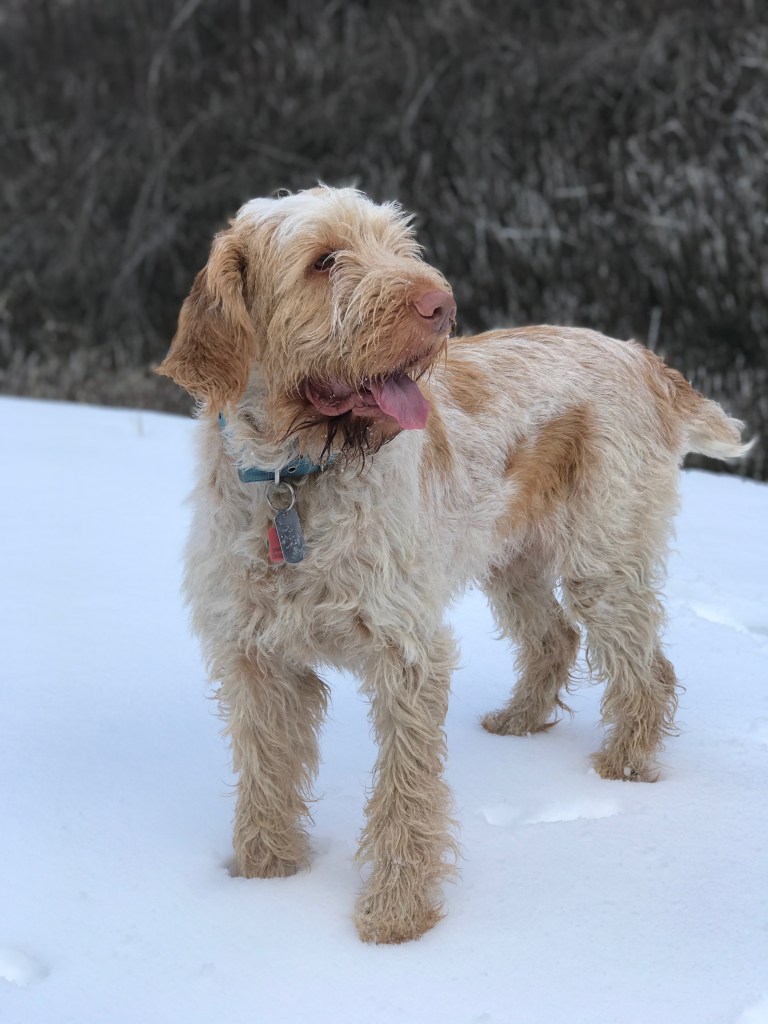 Ultimo del Subasio, or Timo, came to us from Ezio Pagliarini and the del Subasio Kennel of Bastia Umbra, Italy, in November of 2017. He was our beautiful, silly boy that loved to speak “Chewbacca”, do almost anything Fausti was doing, play in the water, tear through the snow and romp in the fields after ball or bird. He was the son of Rocco del Subasio and Pita del Subasio. His strong Spinoni features and expression said “look into my eyes”. For more information about his pedigree, ENCI, AKC or NAVHDA registrations; PennHip score or DNA analysis for CA, please contact us. We lost Ultimo in the early spring of 2025.